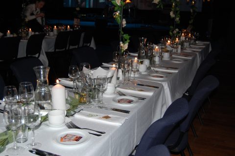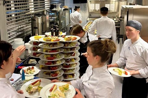 Våre elever ved Restaurant og matfag dekker festbord i skolens aula og forbereder en smakfull og innovativ meny hvor fokus er å ta vare på råvarenes egensmak.